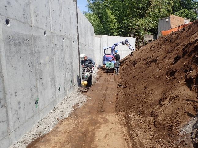 透水性砕石・パイプドレーンで排水機能を保持し、土圧を安定化。