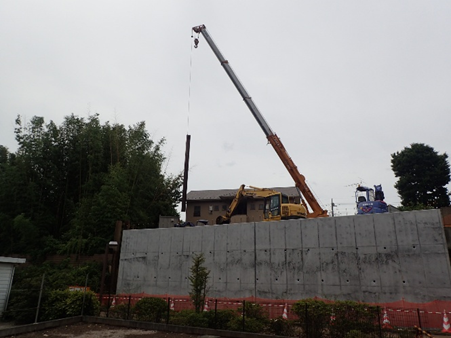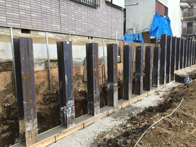 この工法は、H形鋼を「親杭」として一定間隔で地中に打ち込み、