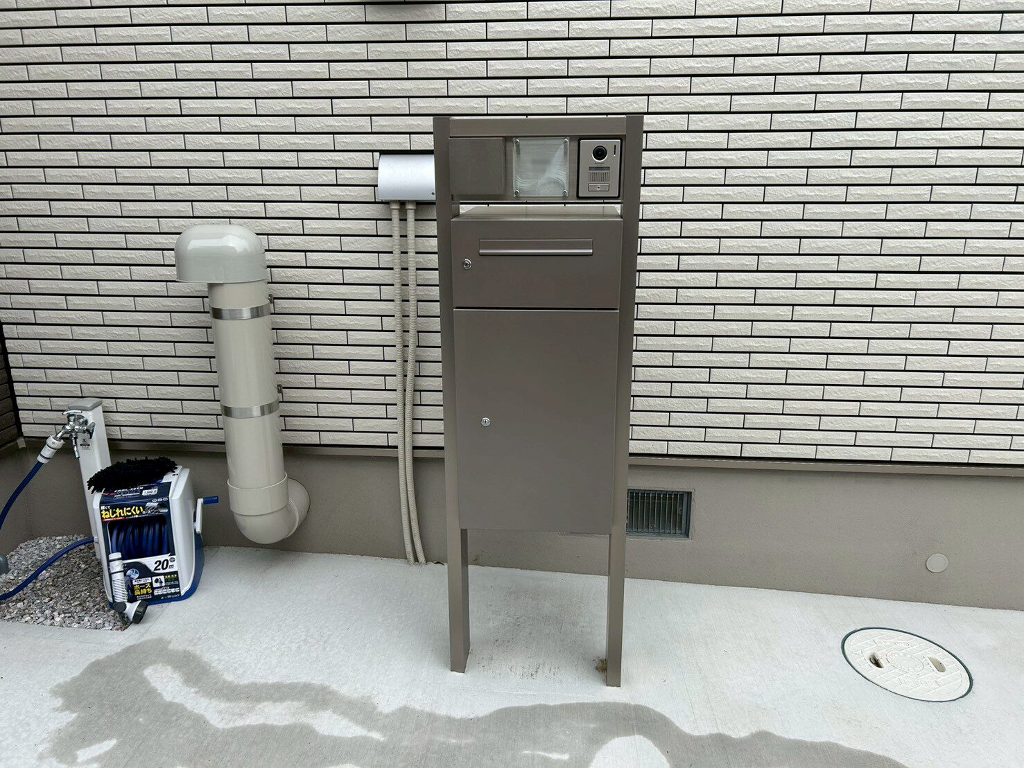 玄関横には、ポスト・インターホン・宅配ボックスが一体となった機能門柱を設置。