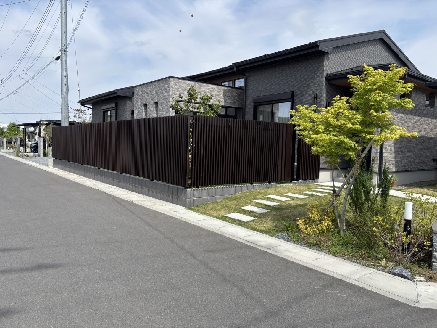 横長のデザインが美しい建物に対し、縦格子の目隠しフェンスを採用することで、重厚感の中に軽やかさと高いデザイン性をプラスしました。