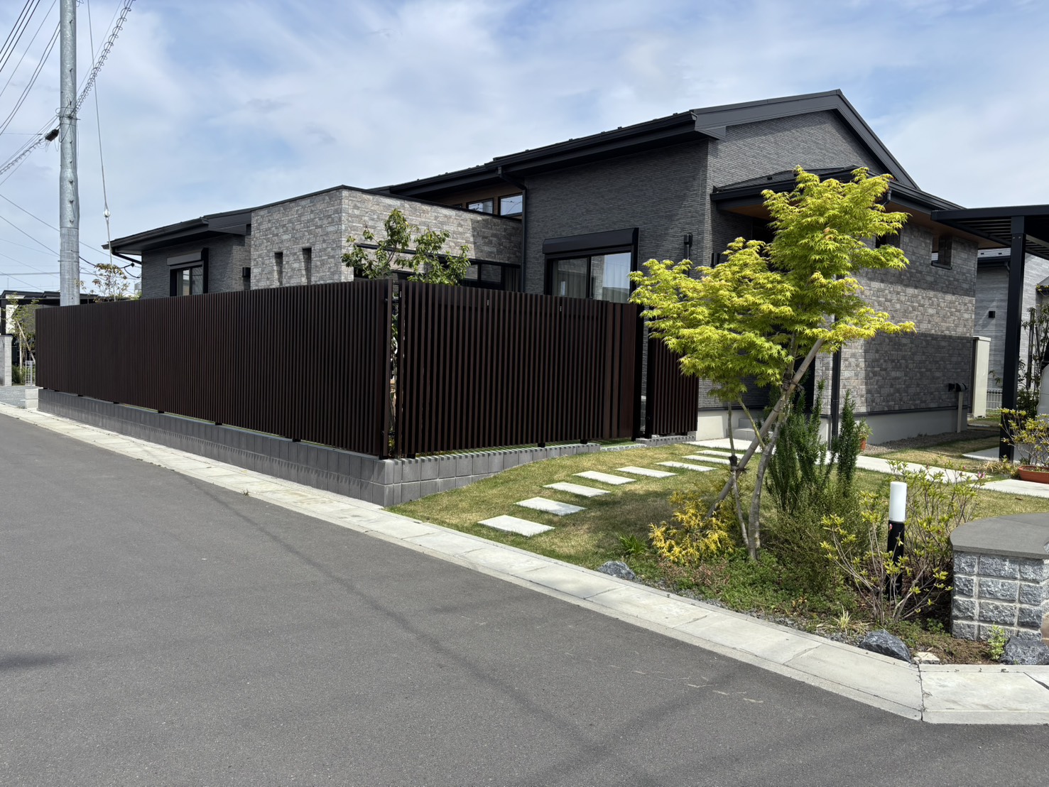 落ち着いたグレー・ブラックを基調とした建物に合わせ、外構もトーンを統一。